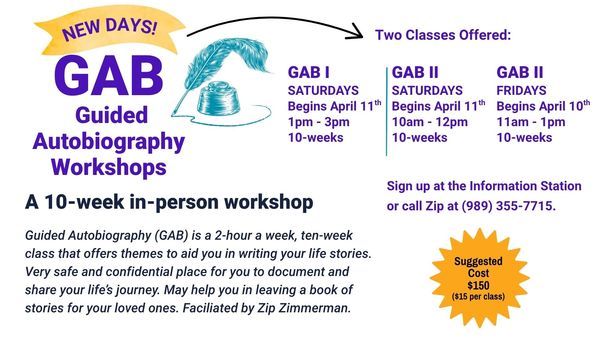 Guided Autobiography (GAB) is a 2-hour a week, ten-week class that offers themes to aid you in writing your life stories. Very safe and confidential place for you to document and share your life’s journey. May help you in leaving a book of stories for your loved ones. Facilitated by Zip Zimmerman. Call Zip (989.355.7715) to register or contact the QU office.
