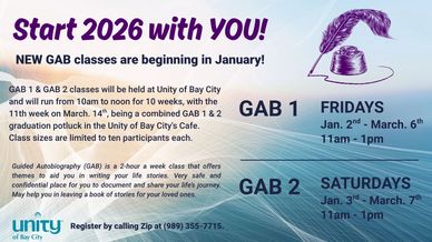 GAB 1 & GAB 2 classes will be held at Unity of Bay City and will run from 10am to noon for 10 weeks, with the 11th week on March. 14th, being a combined GAB 1 & 2 graduation potluck in the Unity of Bay City's Cafe.