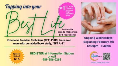 In this workshop, you will be introduced to Tapping, EFT (Emotional Freedom Technique) and learn how to use it to create a better, healthier life for yourself. Bring your aches and pains. Bring your desire for new tomorrows. The best part of Tapping in a group like this is what we call, “Borrowed Benefits”. It only occurs in a group. It is truly amazing. You will feel better after just attending this group. You are about to learn a technique that most people come to when nothing else works.